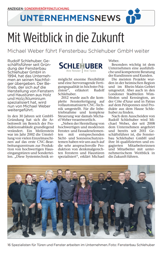 Die Fensterbau Schlehuber GmbH steht seit 1994 für hochwertige Fenster und Haustüren aus Holz sowie Holz/Aluminium. Durch die frühzeitige Umstellung auf moderne CNC-Technik wurden Präzision, Flexibilität und Fertigungsqualität kontinuierlich verbessert.